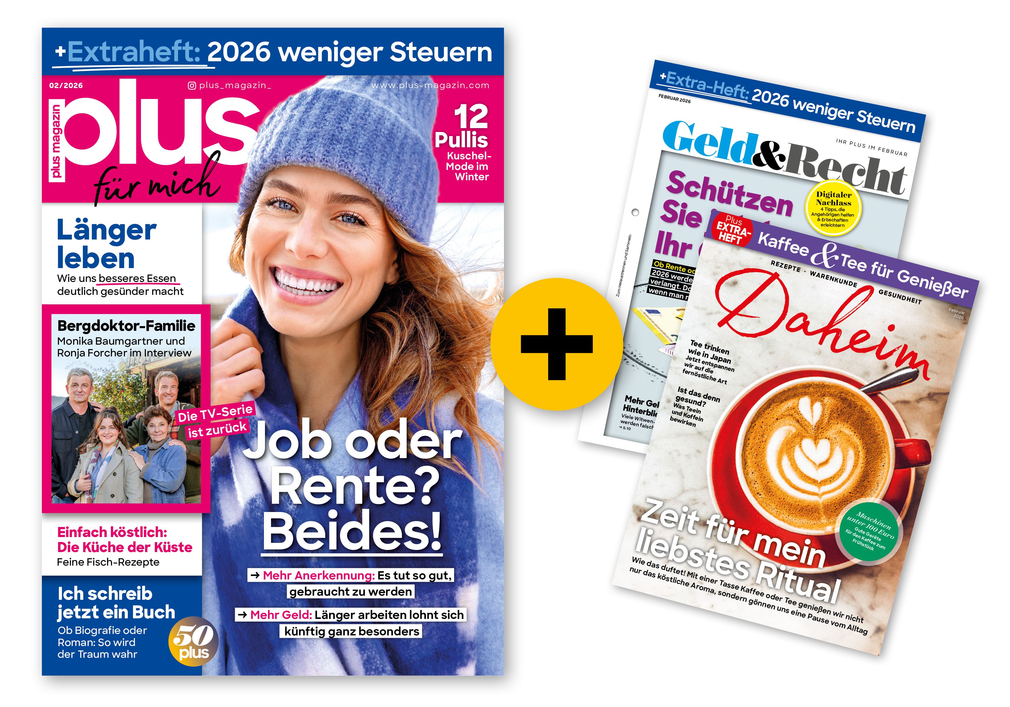 plus Magazin liefert seit fast 25 Jahren Monat für Monat die Themen, die Sie besonders interessieren: Gesundheit, Vorsorge, Rente, Familie, Reise, DIY, Psychologie, Kultur und Ernährung. Hochwertige Gestaltung und gut verständliche, praxisnahe Texte sorgen für den Mehrwert, den man von einem anspruchsvollen Magazin erwarten kann.